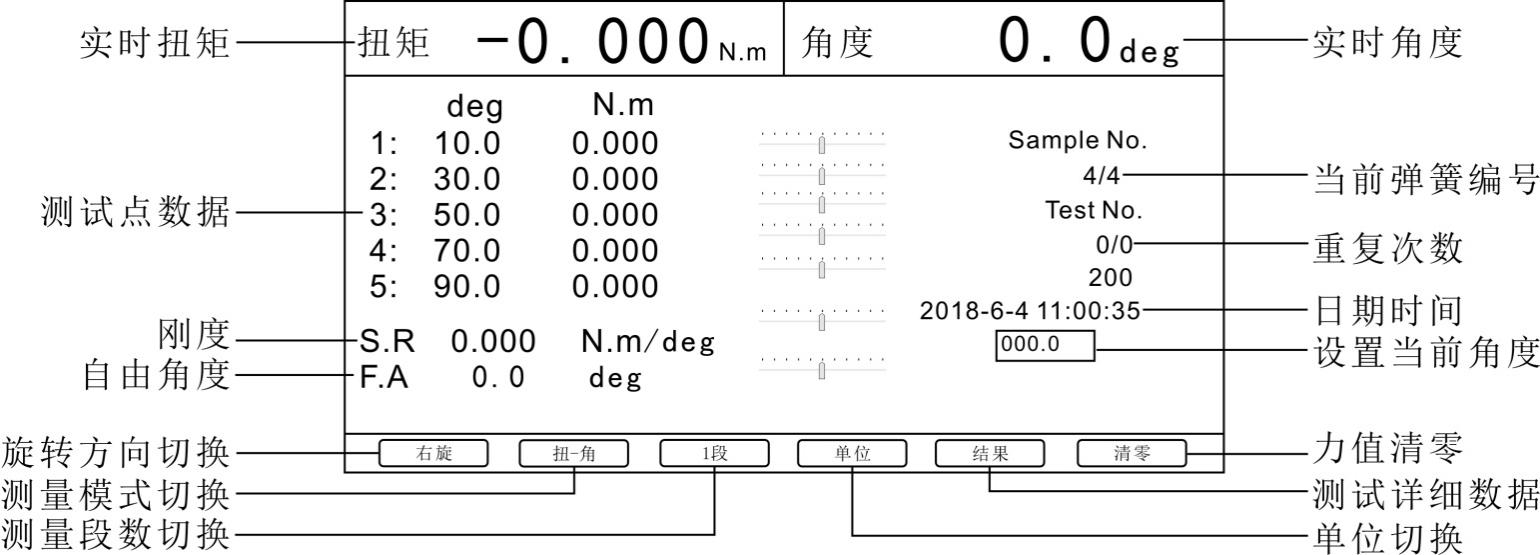 e、测量段数:根据设置的测量段数测试相应的弹簧测试点数,1段就是求第一个测试点的角度或扭力。